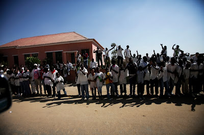 Num dos dias fomos ao Lubango, Província da Huila. No aeroporto fomos recebidos com danças de uma tribo local e por uma multidão, principalmente miúdos das escolas que no percurso do aeroporto até à casa do Governador que são 7km nos acenavam com bandeirinhas e gritavam de alegria.